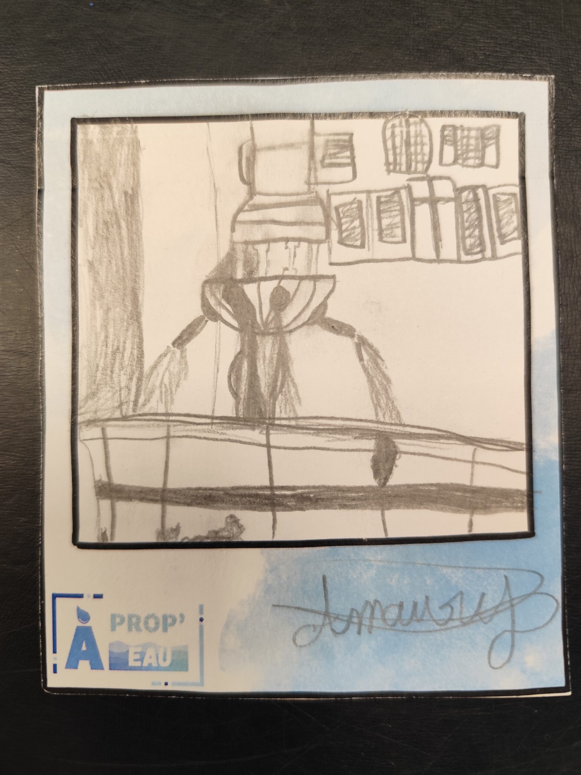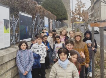 Les élèves se sont ensuite baladé au fil des rues, entre fontaines et ruisseaux souterrains, jusqu’à arriver au niveau de l’exposition « Eau, source du patrimoine » située au niveau du jardin public. La classe a donc pu apprécier les photos de Jérémie Mazet et poser devant l’exposition !