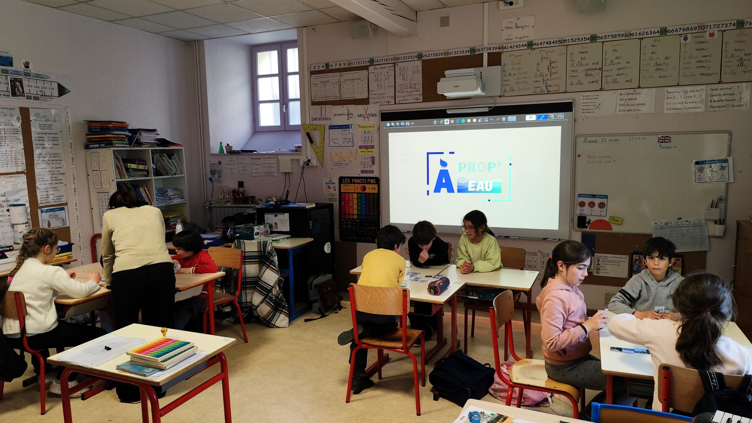 Pour la première séance, le lundi 23 mars, la classe a suivi les aventures de Gougoutte à la rencontre du patrimoine local lié à l’eau. Entre grand et petit cycle de l’eau, cette présentation interactive a, par la même occasion, permis aux enfants de découvrir les photos de l’exposition « Eau, source du patrimoine ». L’après-midi s’est conclu par de petites activités ludiques telles qu’un domino reprenant les photos de l’exposition ou un mémo autour du patrimoine lié à l’eau.