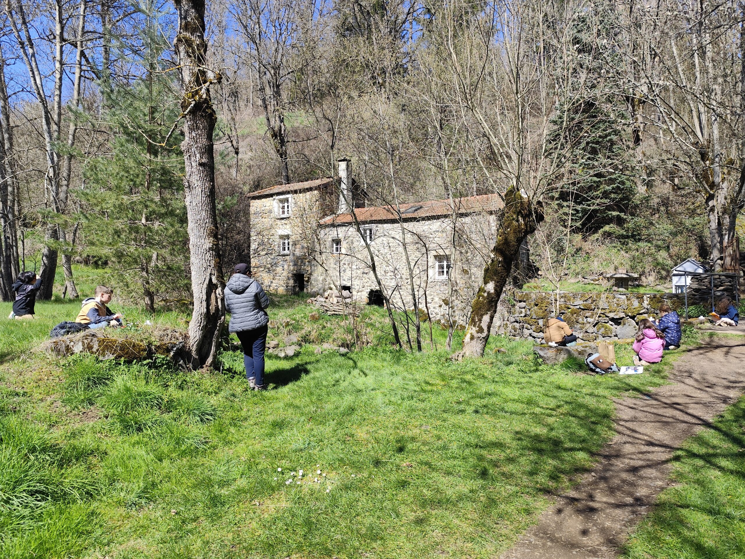 La semaine suivante, juste avant les vacances, la classe, grâce à une petite balade, est partie à la rencontre du patrimoine du village de Saint-Privat-d’Allier. Le groupe a d’abord longé le ruisseau Rouchoux avant d’arriver au niveau du moulin de Piquemeule. Tels de vrais photographes professionnels, chaque élève a observé le moulin et les environs avant de réaliser une photo mentale du lieu !