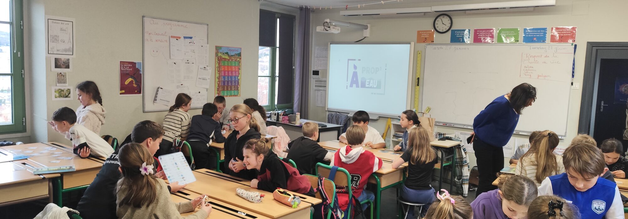 Pour la première séance, le mardi 27 janvier, la classe a suivi les aventures de Gougoutte à la rencontre du patrimoine local lié à l’eau. Cette présentation interactive a permis aux enfants de découvrir le grand et le petit cycle de l’eau. Les enfants ont aussi pu observer les photos de l’exposition « Eau, source du patrimoine ». L’après-midi s’est conclu par de petites activités ludiques telles qu’un mémo autour du patrimoine lié à l’eau ou un dobble version patrimoine lié à l’eau.